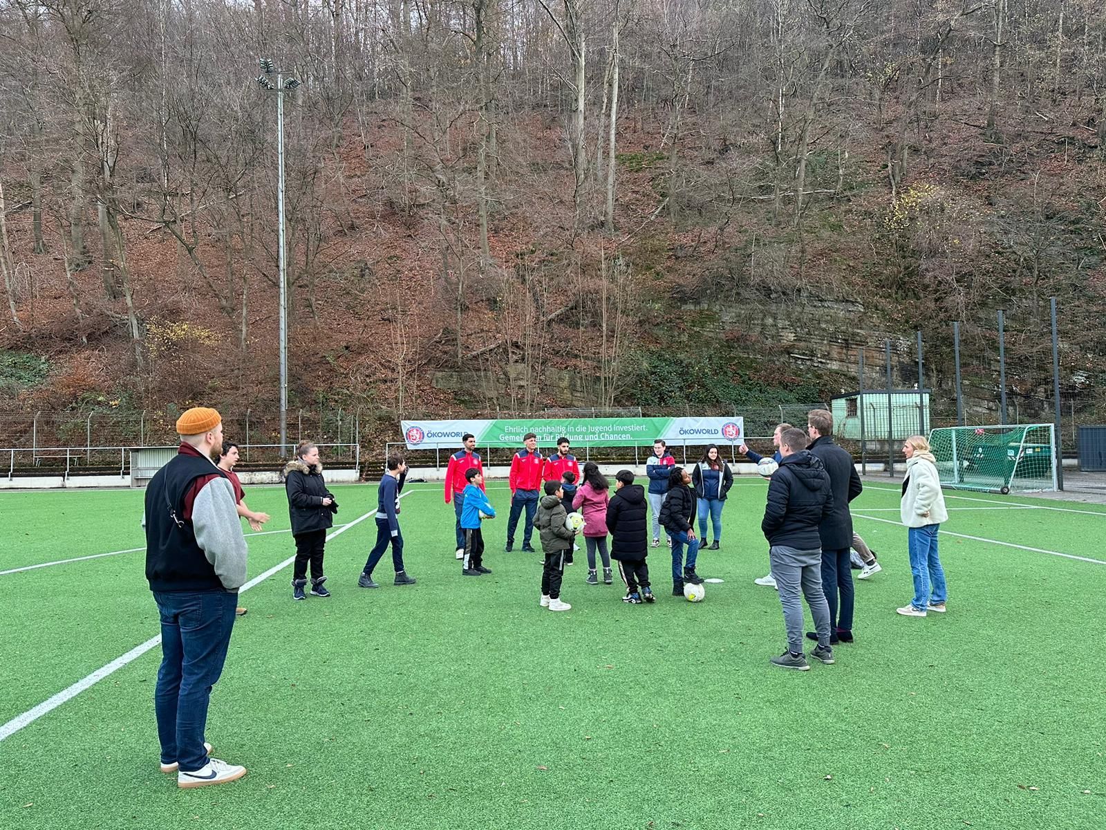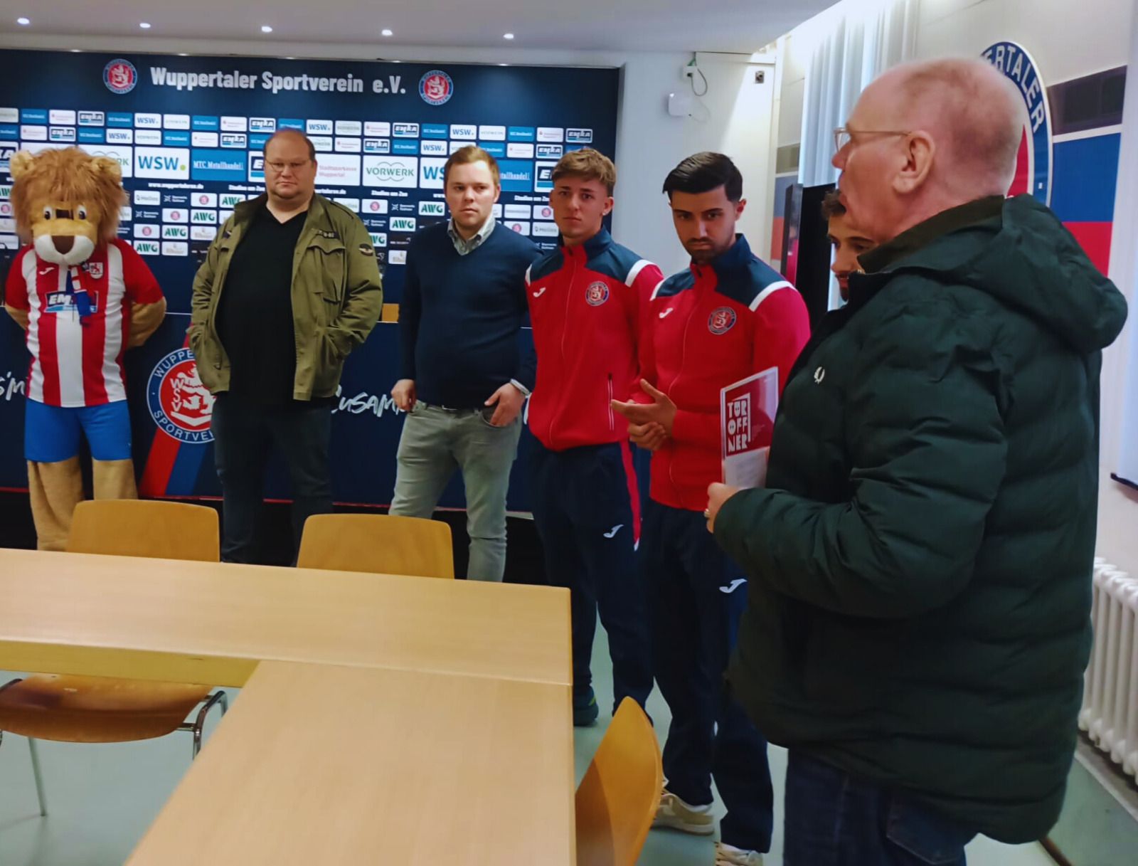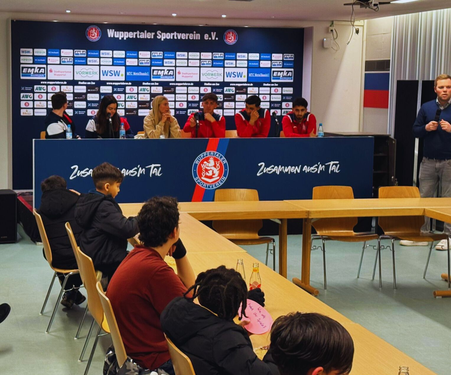Wuppertaler SV im Stadion am Zoo und durften dort einen spannenden und sportlichen Einblick gewinnen. Zunächst gab es eine Begrüßungsrunde, bei der unter johlender Begeisterung Spieler und Spielerinnen der 1. Mannschaften zu uns stießen. Diese begleiteten uns den Nachmittag über und nahmen sich mit viel Geduld, Offenheit, (Spiel-) Witz und dem ein oder anderen Schmunzeln Zeit für die Kinder.