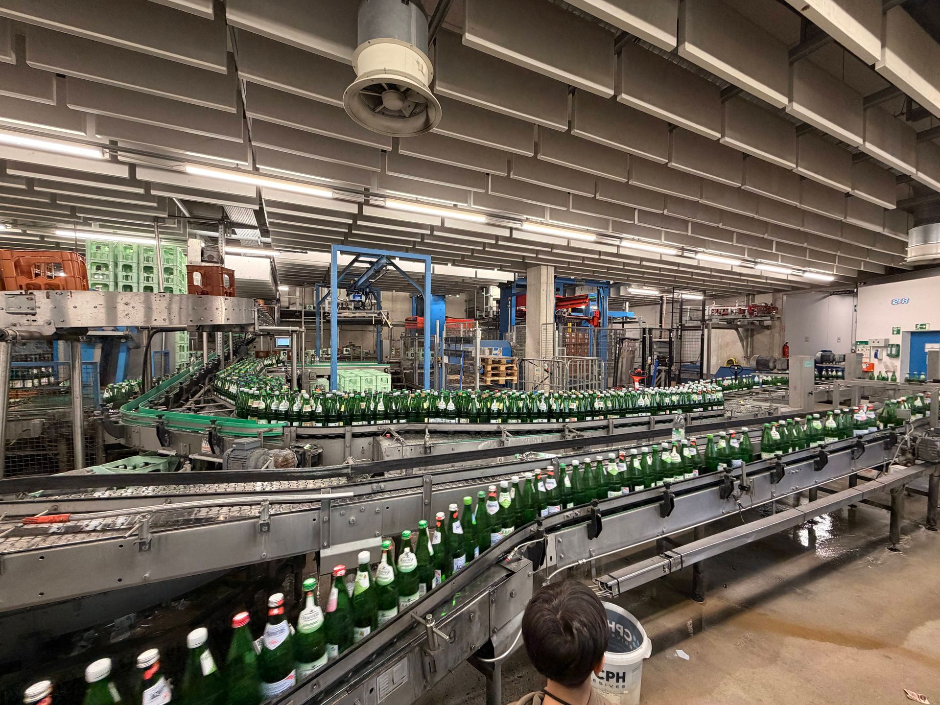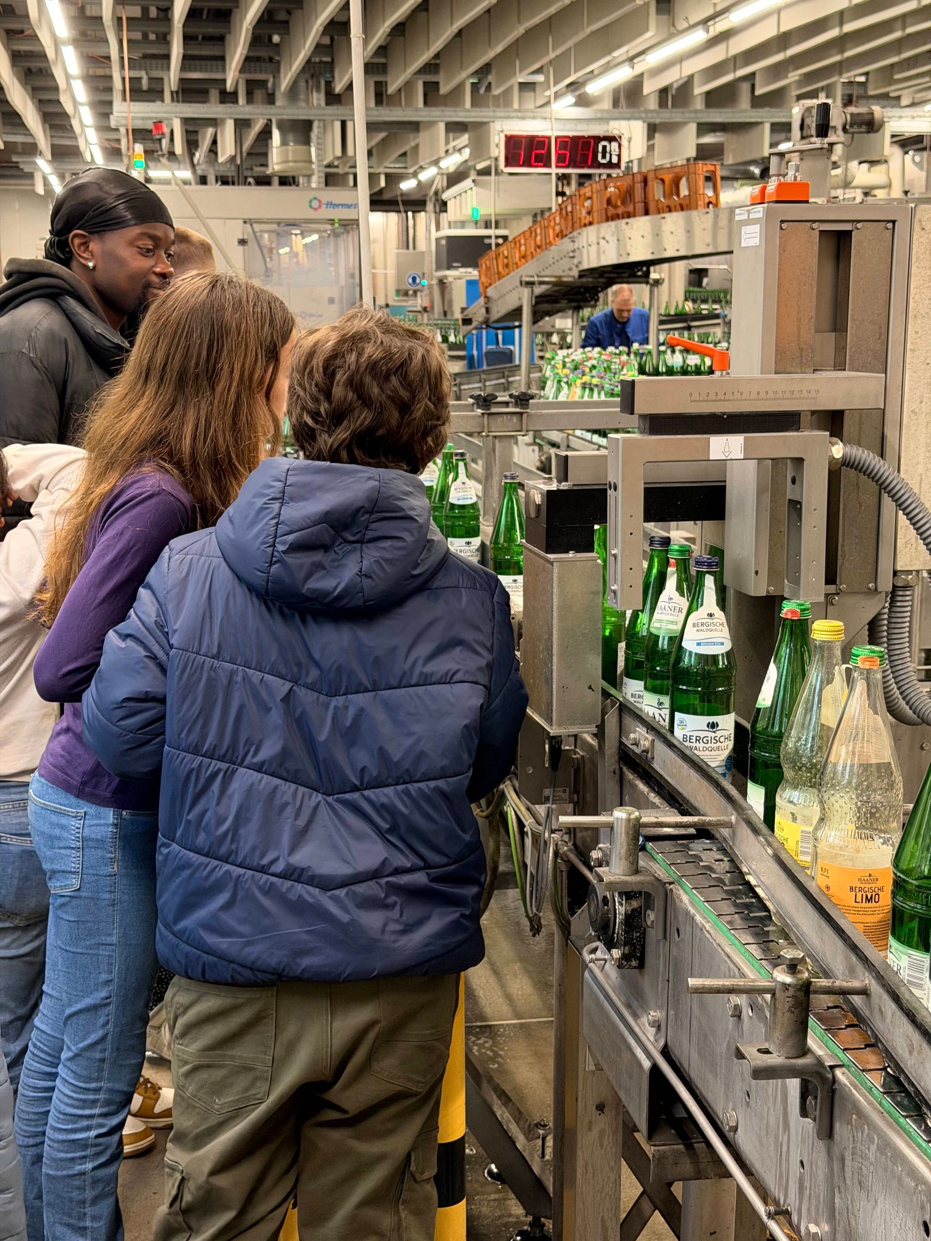 Ein absolutes Highlight erwartete die Gruppe anschließend in der Produktionshalle: Über ihren Köpfen sausten leere Flaschen auf Förderbändern durch die Anlage, bevor sie in den Abfüllprozess gelangten. In drei Schichten werden hier täglich rund 130.000 Flaschen befüllt – eine Zahl, die für großes Staunen sorgte. Besonders faszinierend war die Sortieranlage, deren Geschwindigkeit sich immer wieder sichtbar erhöhte. Auch hierzu gab es viele Fragen, die Herr Sievert geduldig beantwortete.